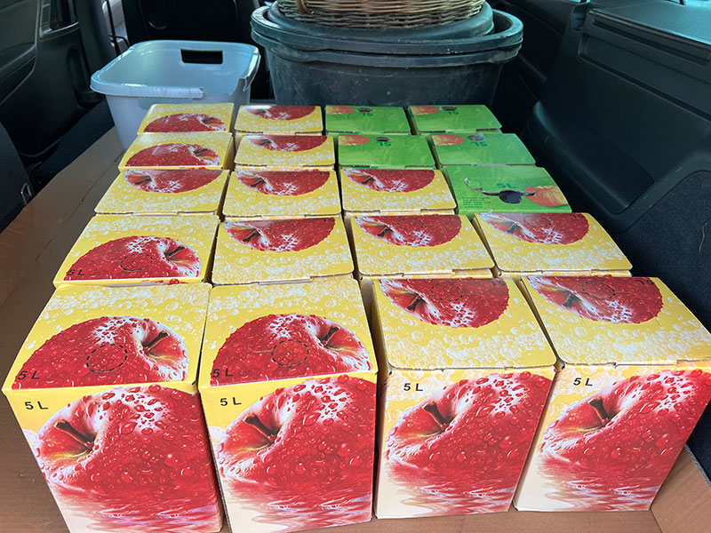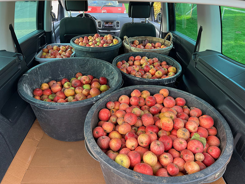 Ein Boskop, ein Kaiser-Wilhelm und einer, dessen Namen wir nicht kennen. Es handelt sich aber um lauter kleine süße Äpfel, toll zum Naschen oder eben zum Saft pressen lassen.