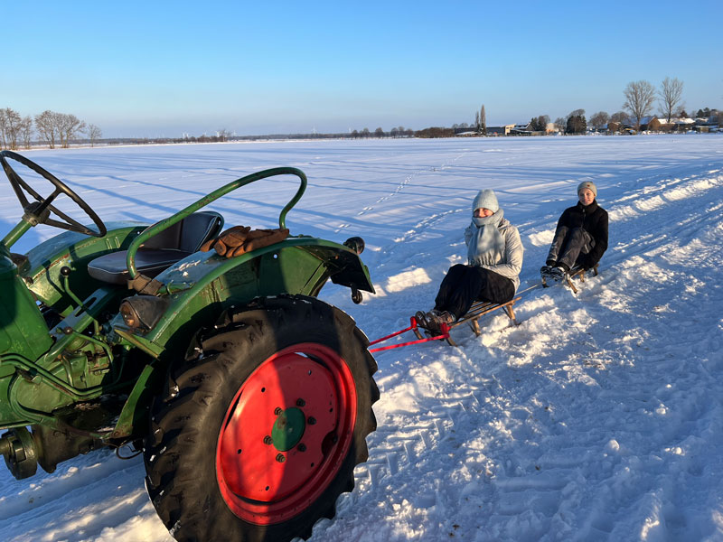Als Erinnerung an die frühere Landwirtschaft behalten wir unseren Deutz D 15. Unsere Kinder würden sonst auch Protest einlegen! So ein alter Deutz springt ja nicht immer sofort und dann auch nicht wirklich geräuscharm an. Aber wenn er anspringt, freut sich doch die ein oder andere über eine kleine Spritztour – vor allem im Winter bei Schnee.